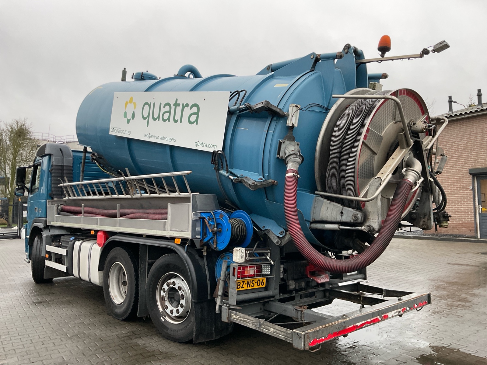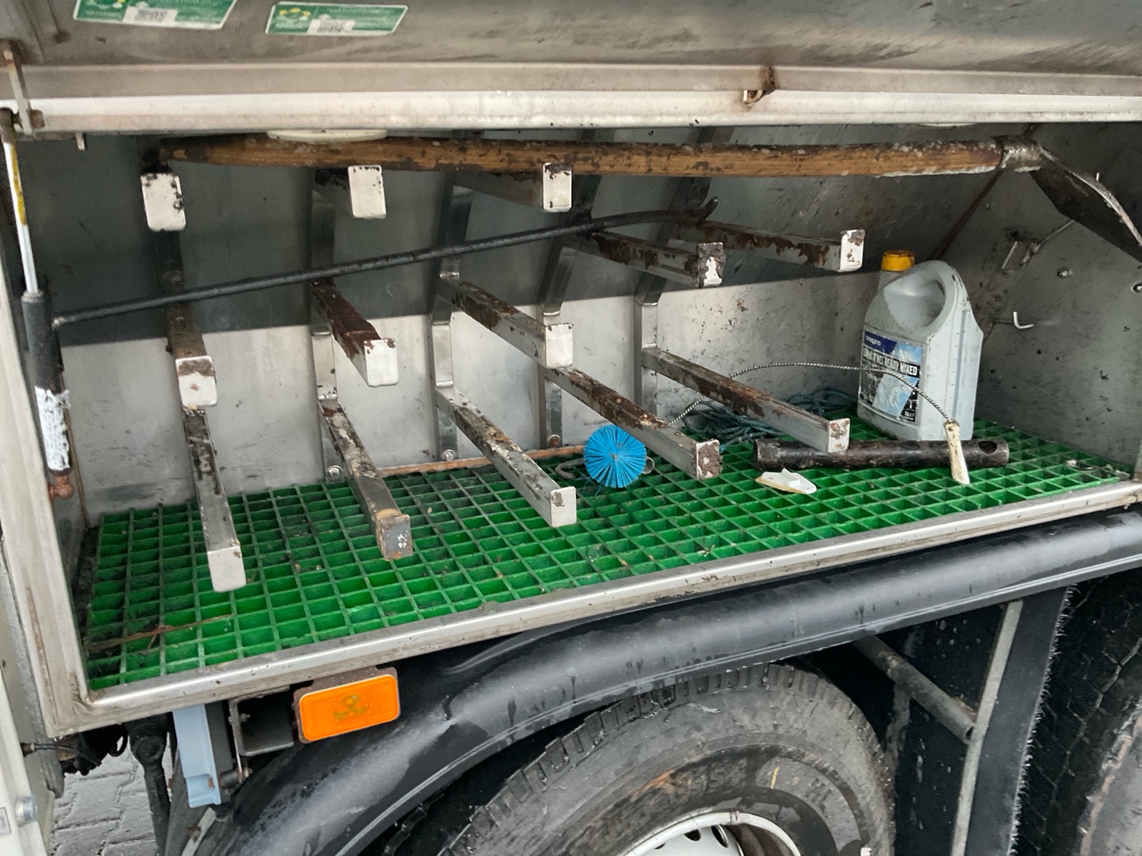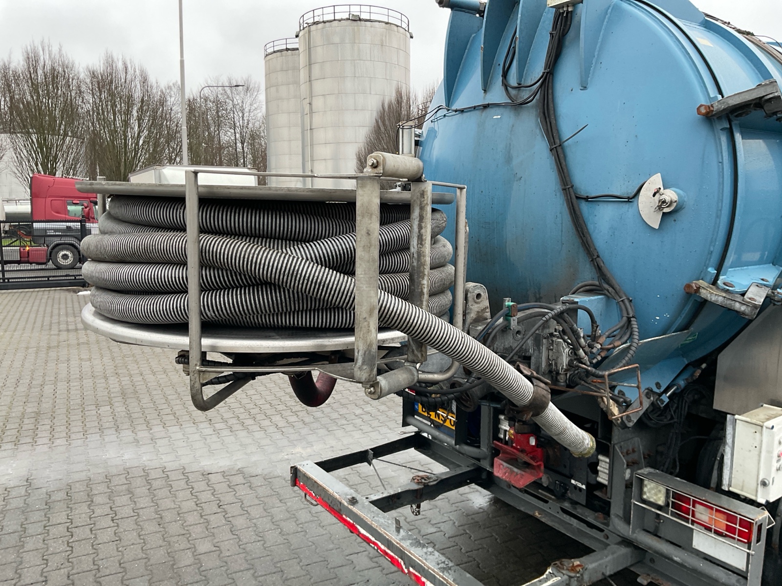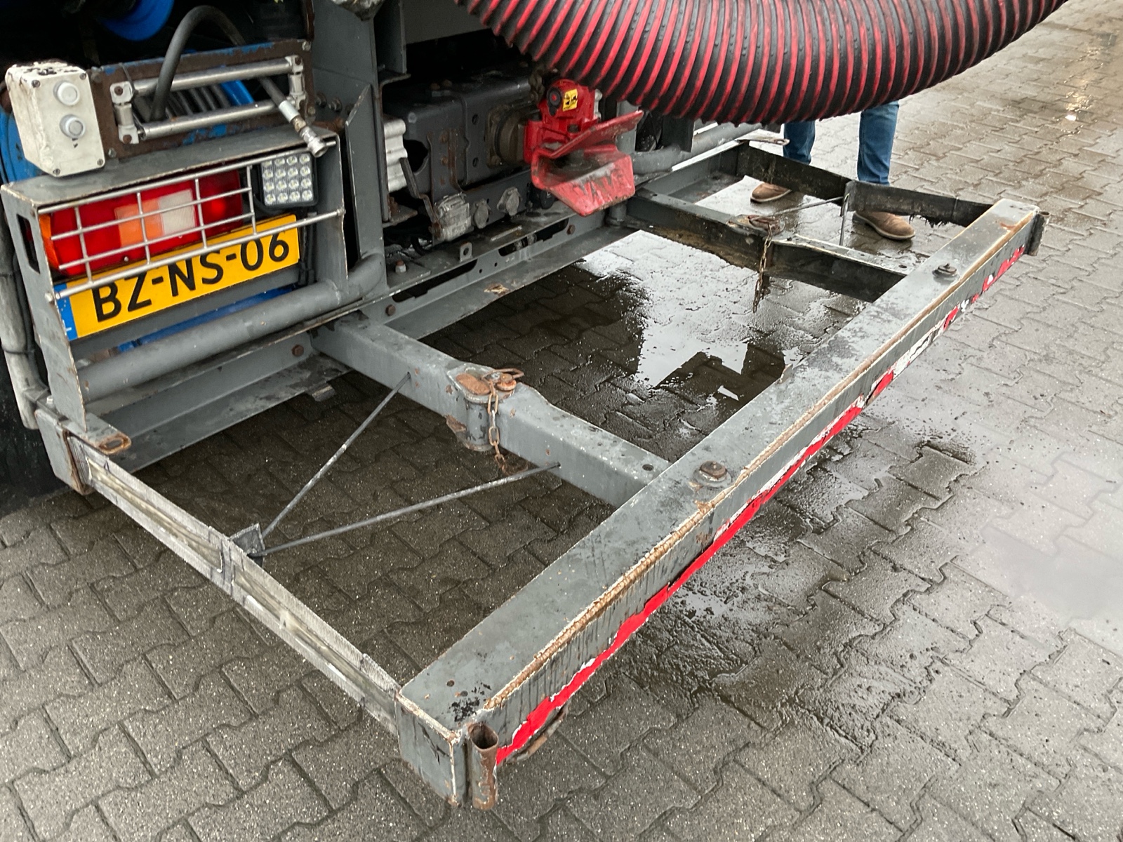 | Constructie beschrijving | Tank wordt gereinigd geleverd Exclusief trap en zijslangen Haspel blijft compleet inclusief slang Vacuüm wagen van merk DHM 13,5 m3 slibinhoud en 1,4 m3 spoelinhoud Samson V30 vacuüm pomp. 2000 m3 per minuut Aquabar hogedrukpomp max 150 bar en 50 liter per minuut Zuighaspel hydraulisch horizontaal en verticaal te verstellen. Hydraulisch op en afrol Weeginstallatie op luchtvering |