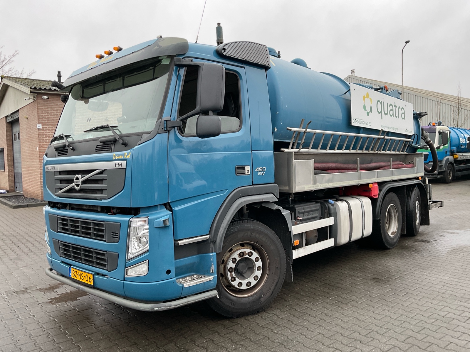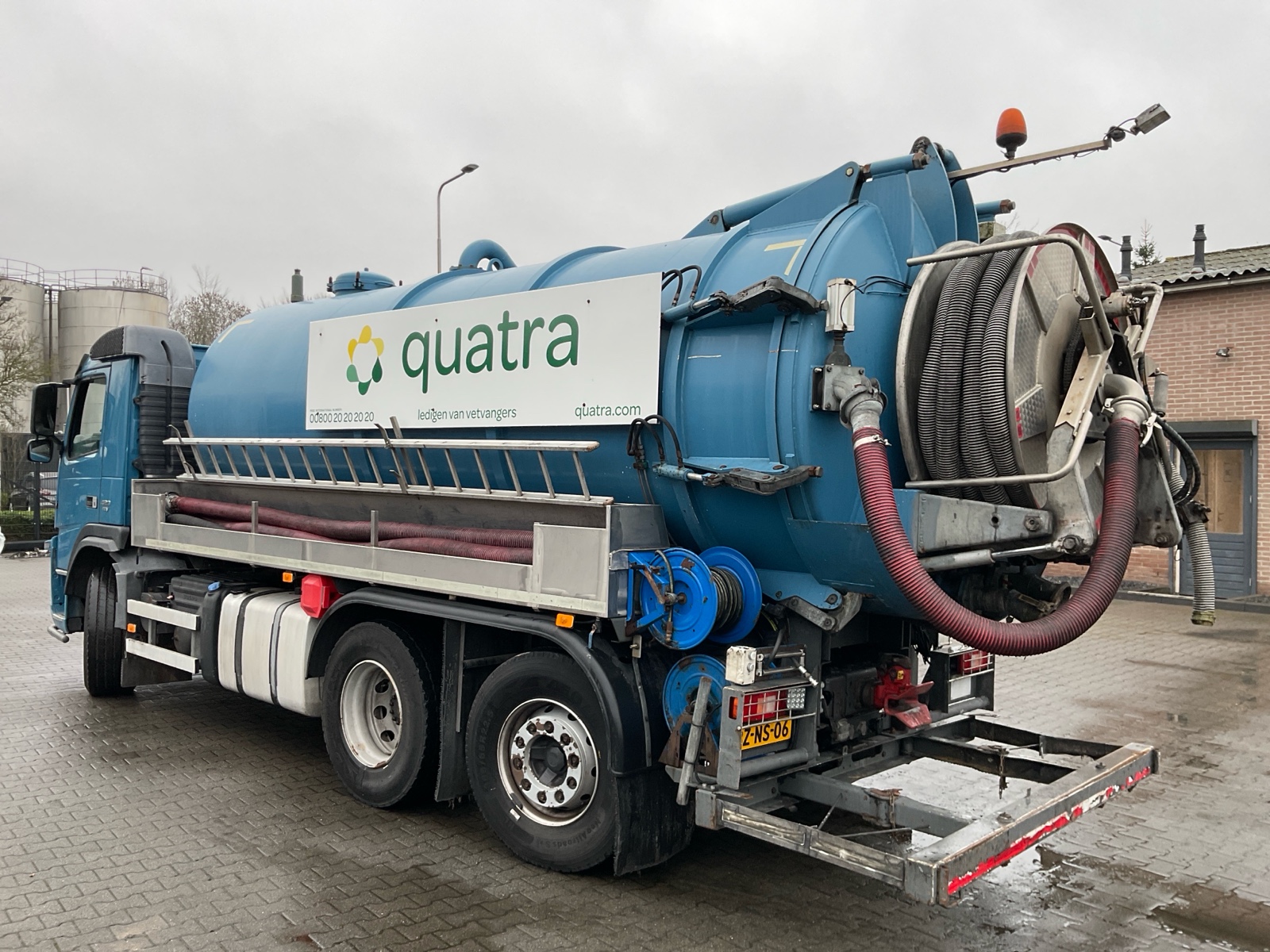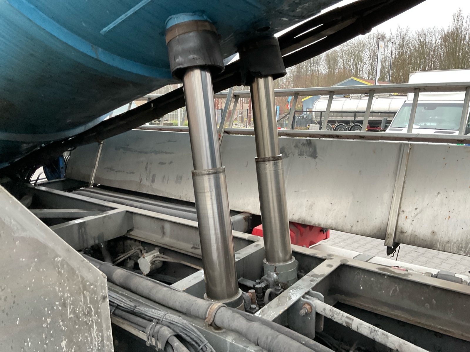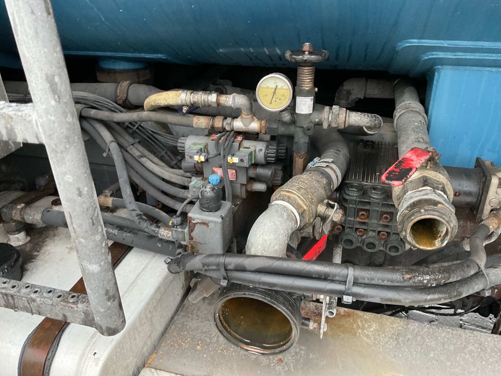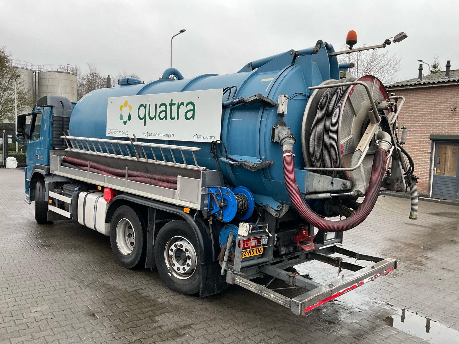 | Constructie beschrijving | Tank wordt gereinigd geleverd Exclusief trap en zijslangen Haspel blijft compleet inclusief slang Vacuüm wagen van merk DHM 13,5 m3 slibinhoud en 1,4 m3 spoelinhoud Samson V30 vacuüm pomp. 2000 m3 per minuut Aquabar hogedrukpomp max 150 bar en 50 liter per minuut Zuighaspel hydraulisch horizontaal en verticaal te verstellen. Hydraulisch op en afrol Weeginstallatie op luchtvering |