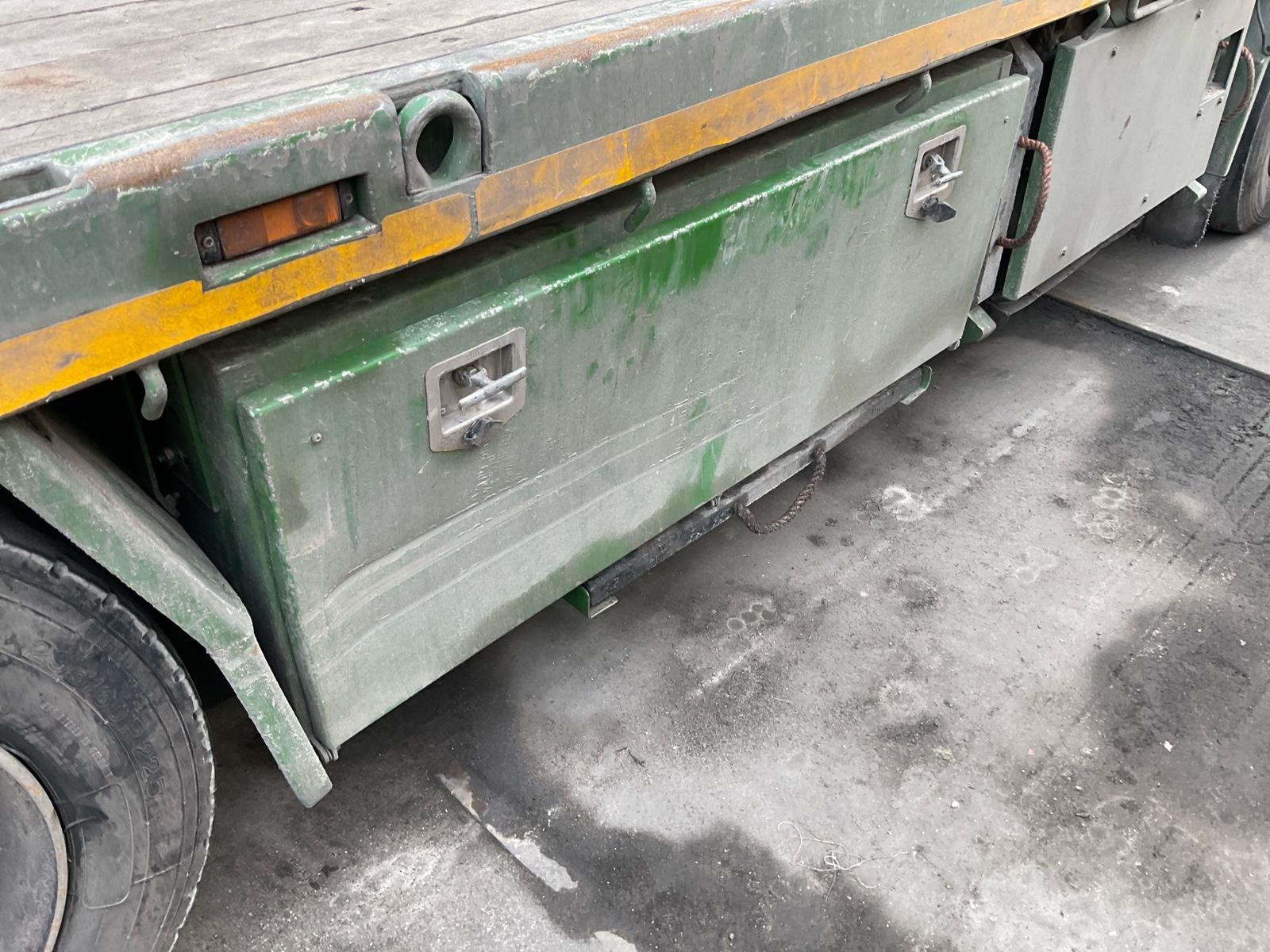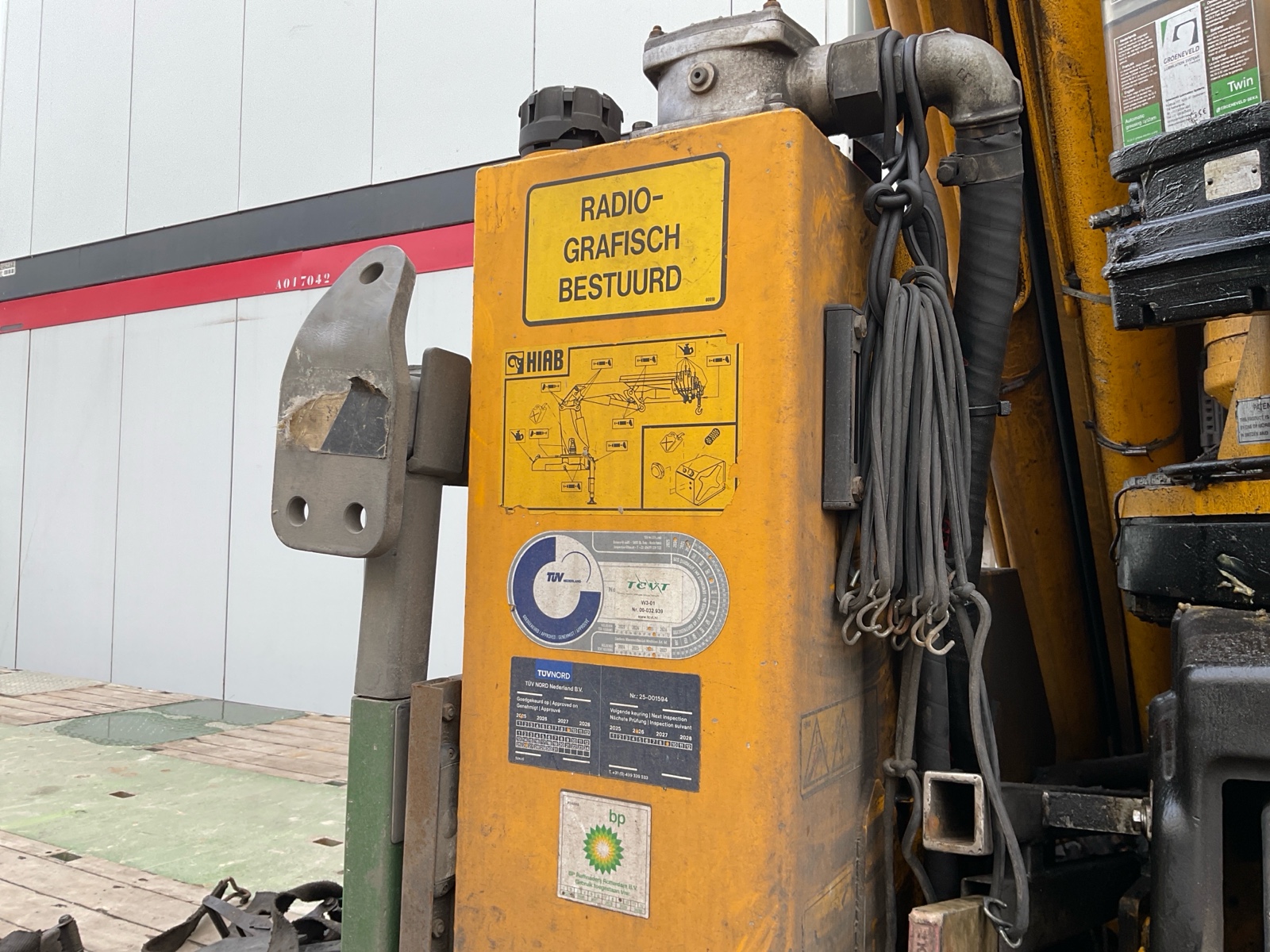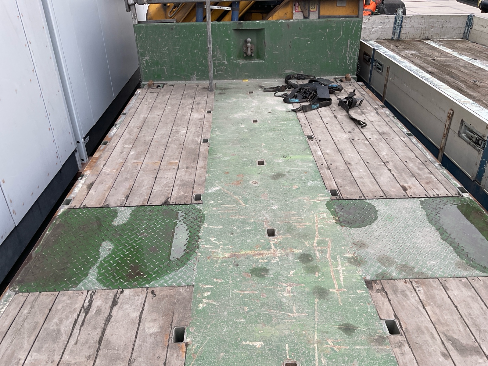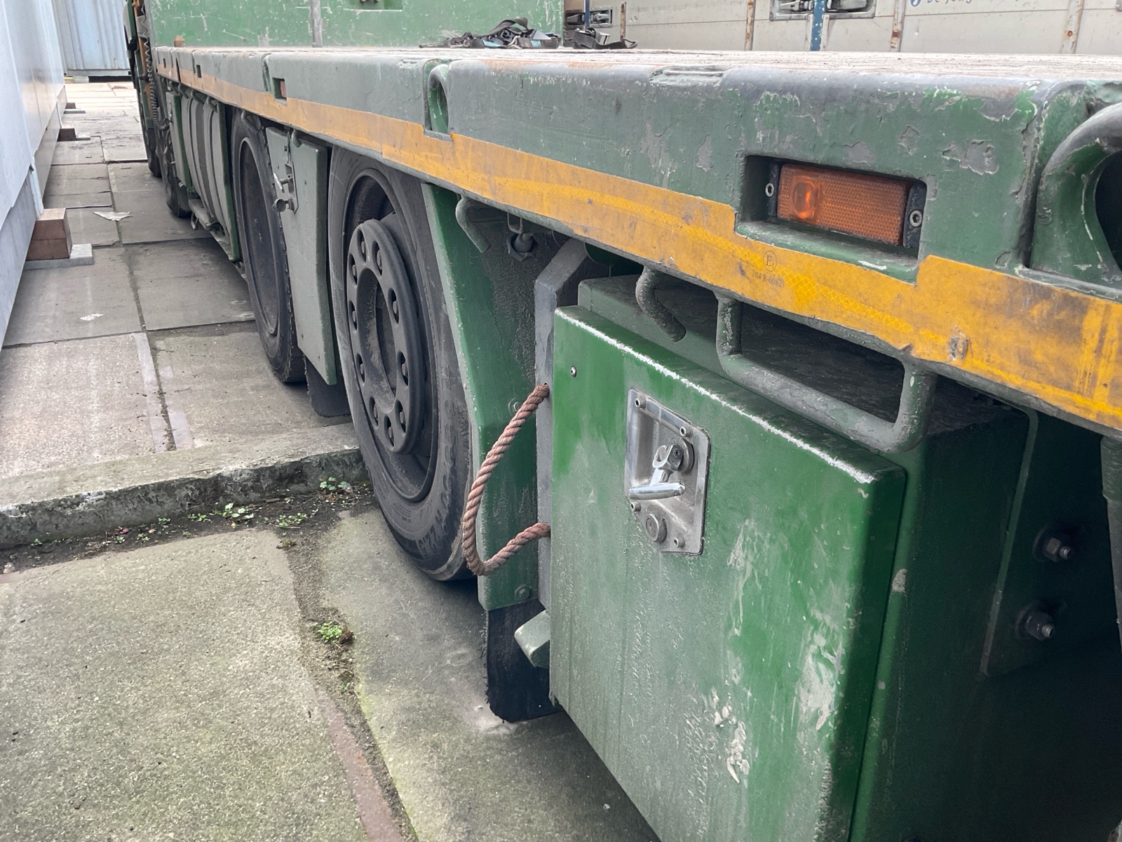 | Constructie beschrijving | Openlaadbak met 4x twistlock, kisten, ronggaten en zware kantbalken met sjorogen Geschopeerde bak Hiab 700 E-8 van 2001 8x hydraulisch uitschuifbaar Afstandbediening Excl evenaar Frontstempels |