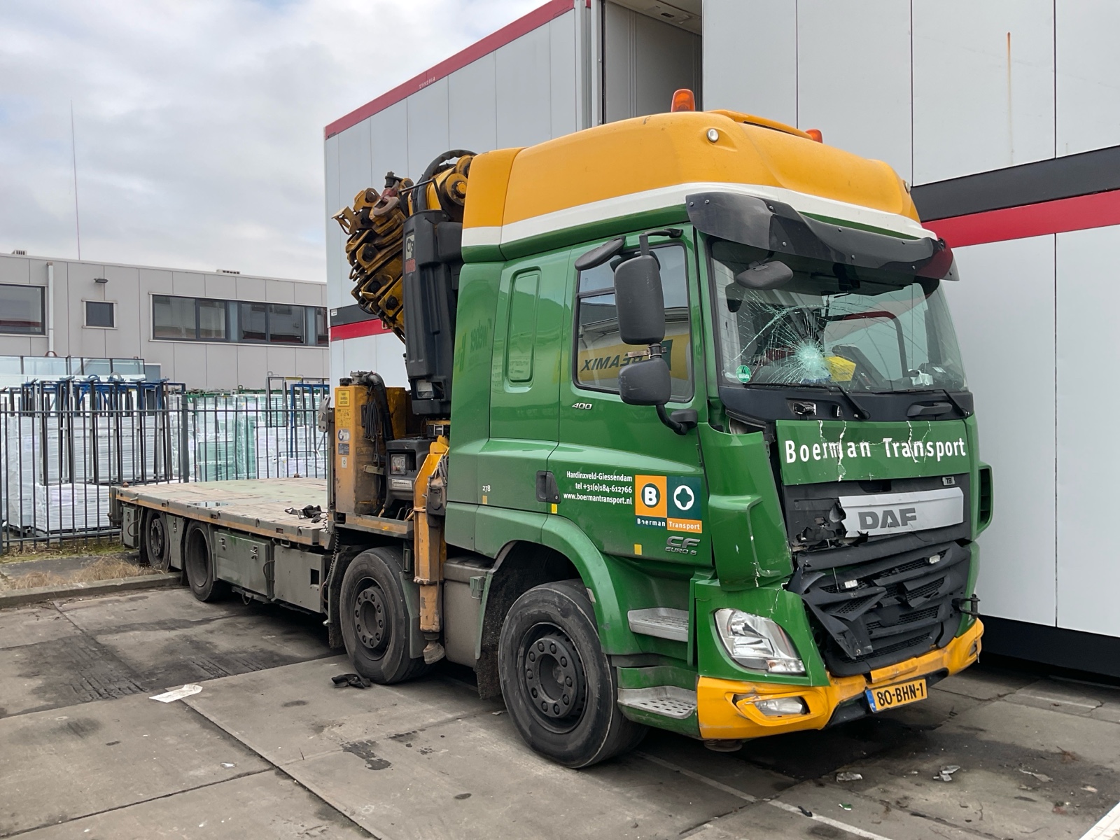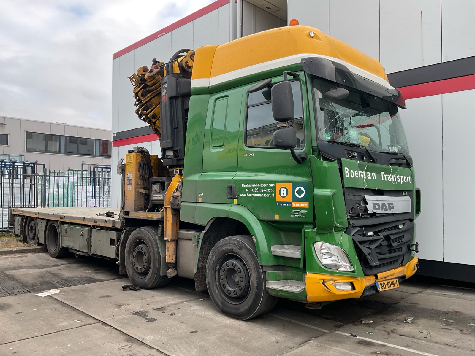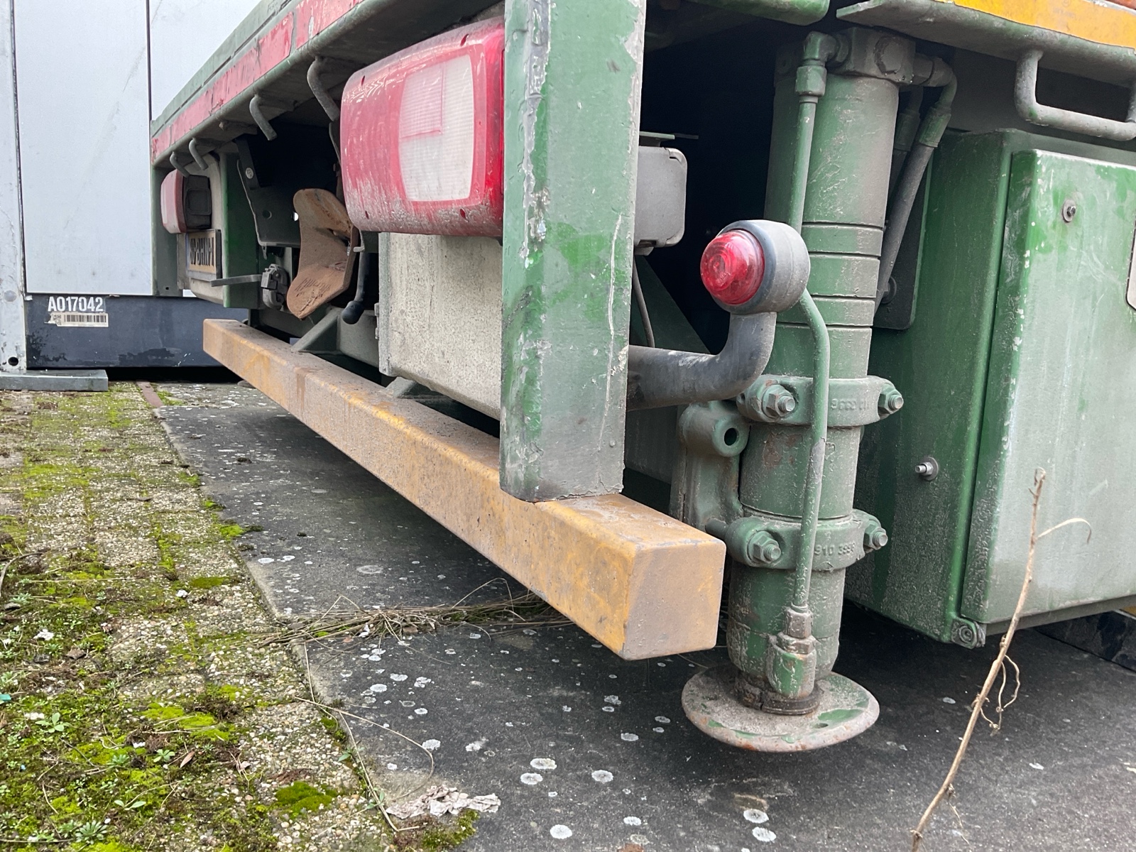 | Constructie beschrijving | Openlaadbak met 4x twistlock, kisten, ronggaten en zware kantbalken met sjorogen Geschopeerde bak Hiab 700 E-8 van 2001 8x hydraulisch uitschuifbaar Afstandbediening Excl evenaar Frontstempels |