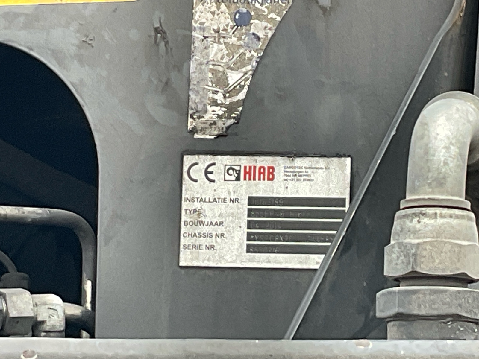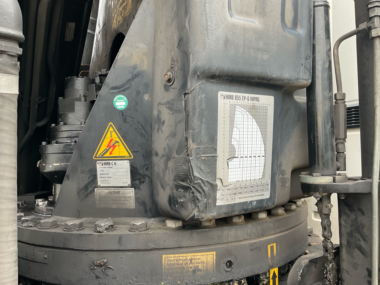 Constructie beschrijving ADR uitgevoerd Hiab 855 HiPro met afstandsbediening 6x hydraulisch uitschuifbaar tot 16,5 meter TCVT tot 3-2027 Film in de link Check technische gegevens voor reparatiepuntjes kraan