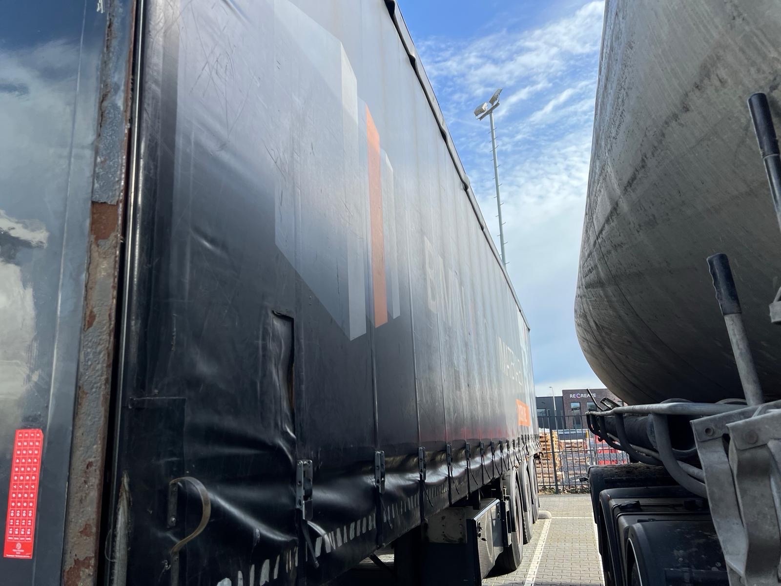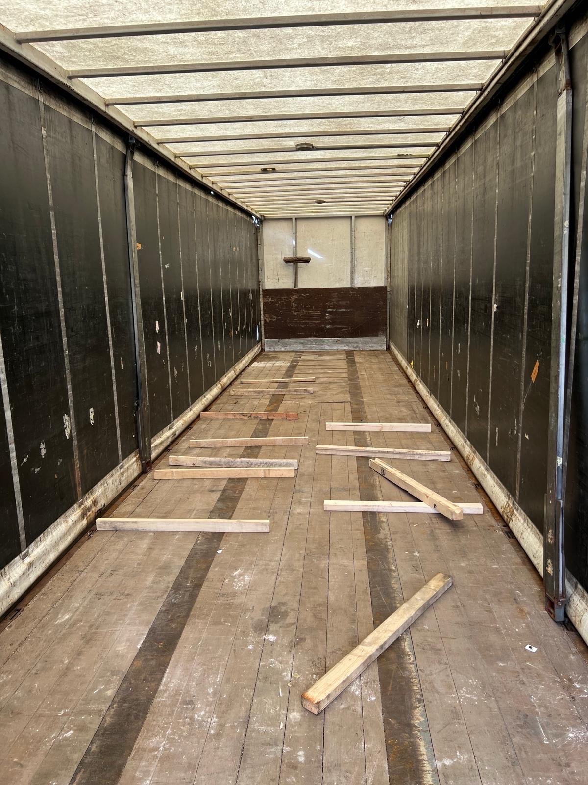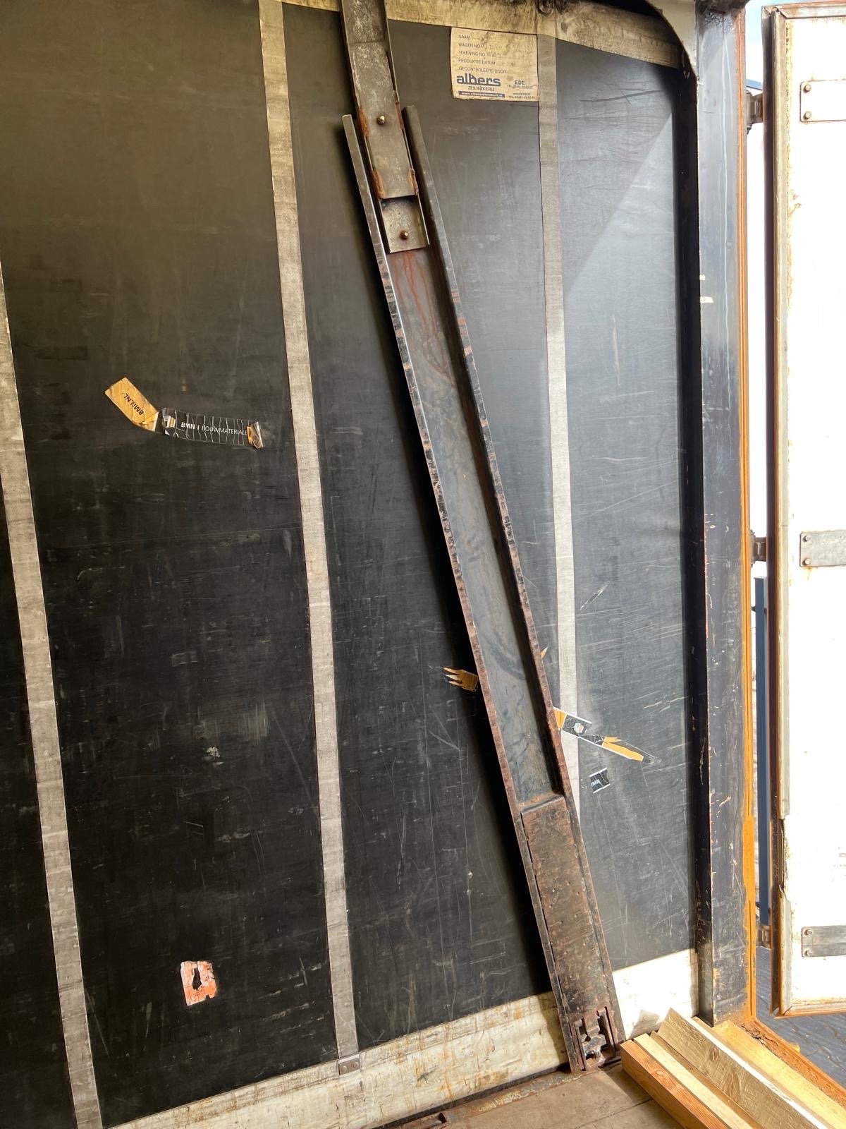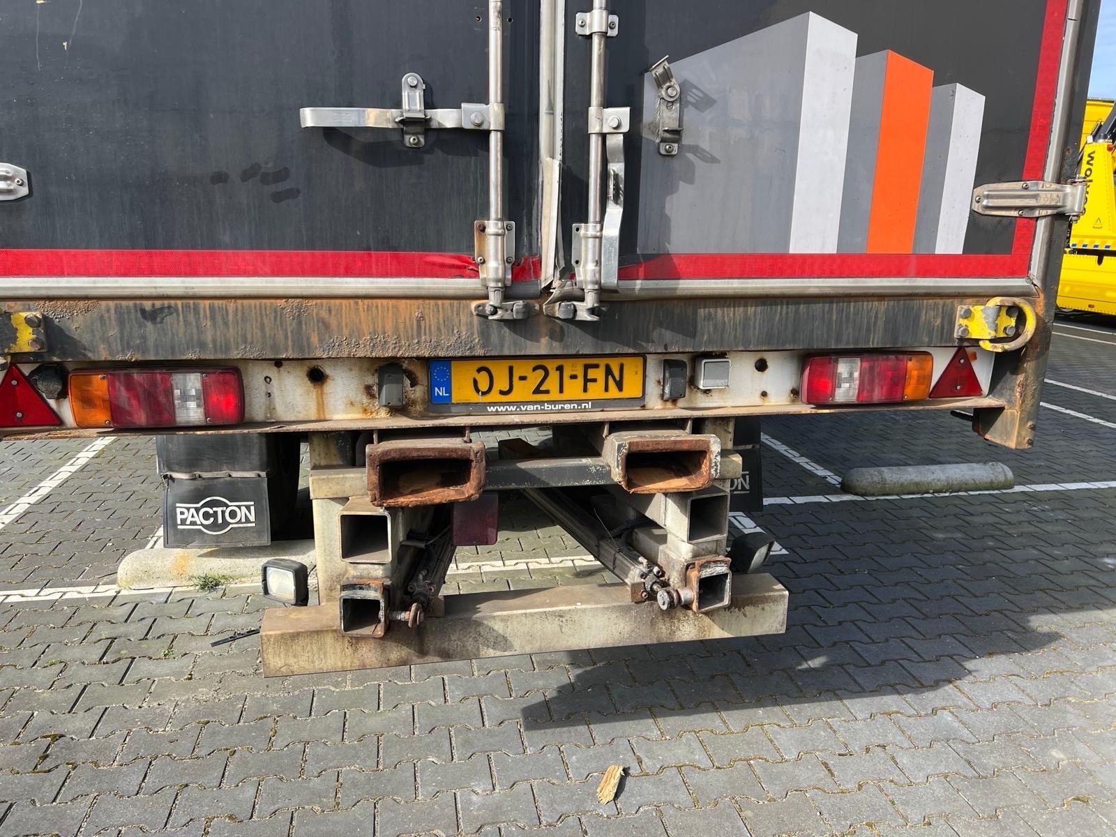 | Constructie beschrijving | 1e en 3e as gestuurd 2e as hefbaar Schuifzeilen. Reclame dient er door koper afgehaald te worden of zwart geschilderd! kooiaap aansluiting Hardhouten vloer en vast dak |